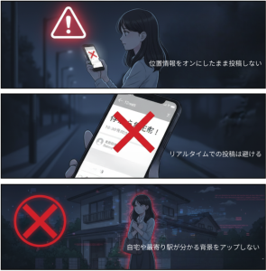 ✔ SNSは位置情報・生活パターンが分かる投稿を避ける